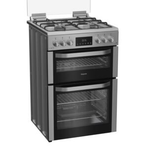 The Hotpoint HDG6GDCX 60cm Gas Double Cooker offers reliable gas cooking with the flexibility of two oven cavities, making it