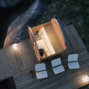 The Barrel Sauna Edda is a beautifully designed outdoor sauna that combines traditional sauna performance with a distinctive barrel shape.