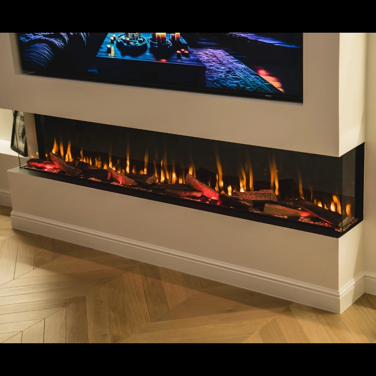 The Advance Series By Evolution Fires is a multi sided media wall fire specially designed to be built into a wall. The panoramic viewing area allows you to select from a 1-sided (front view), 2-sided (corner aspect) and 3-sided fire (panoramic view). It’s the ideal choice for creating a media wall. The fireplace boasts a stunning, realistic flame effect, fuel bed/mood lighting, and an easy-to-use multi-function LCD display remote control, App control and Alexa Compatible with an in-built thermostat.