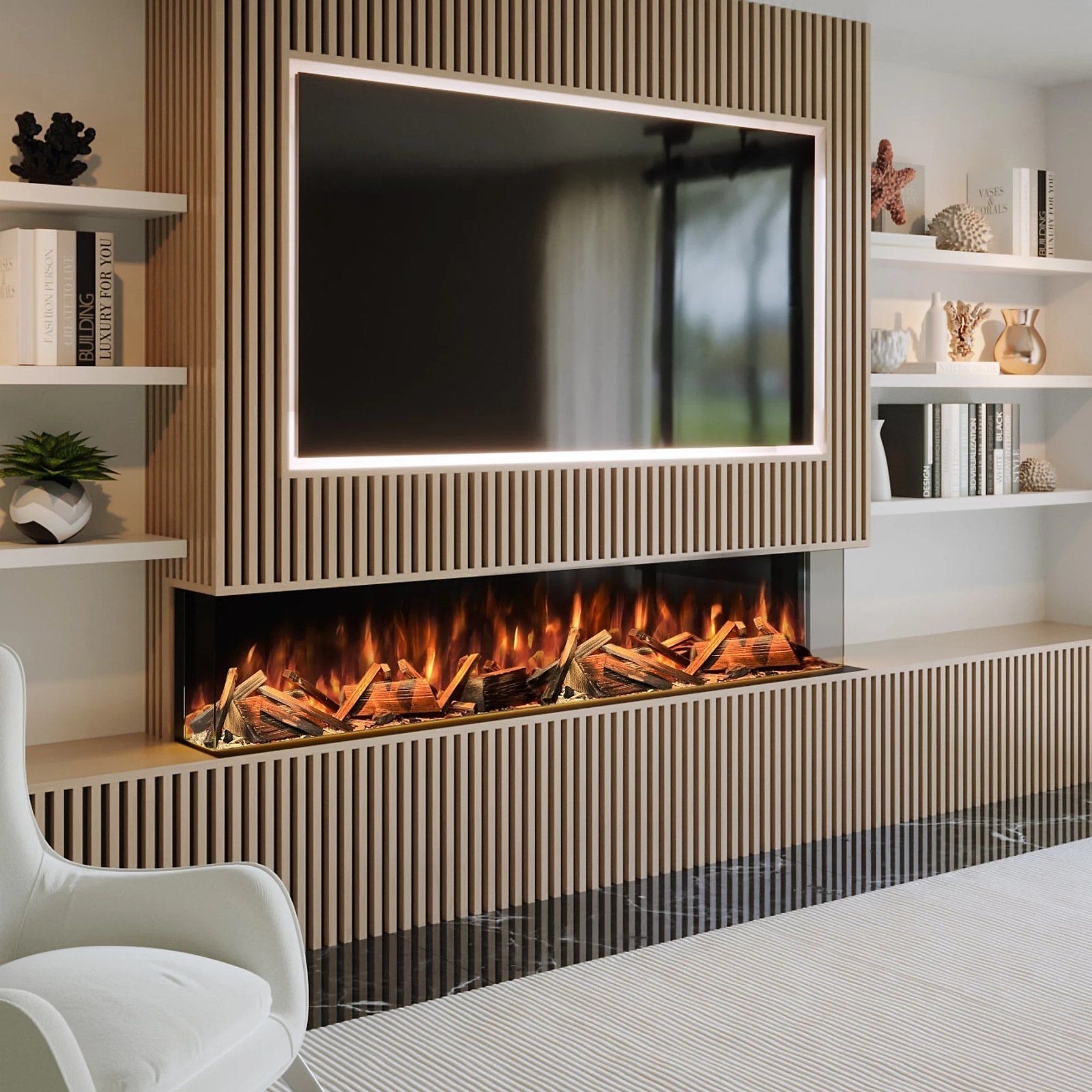 The Advance Series Media Wall Fire By Evolution Fires is a showroom quality product built with all the industries latest technology. The panoramic viewing area allows you to select from a 1-sided (front view), 2-sided (corner aspect) and 3-sided fire (panoramic view). It’s the ideal choice for creating a media wall. The fireplace boasts a stunning, realistic flame effect, fuel bed/mood lighting, and an easy-to-use multi-function LCD display remote control, App control and Alexa Compatible with an in-built thermostat.