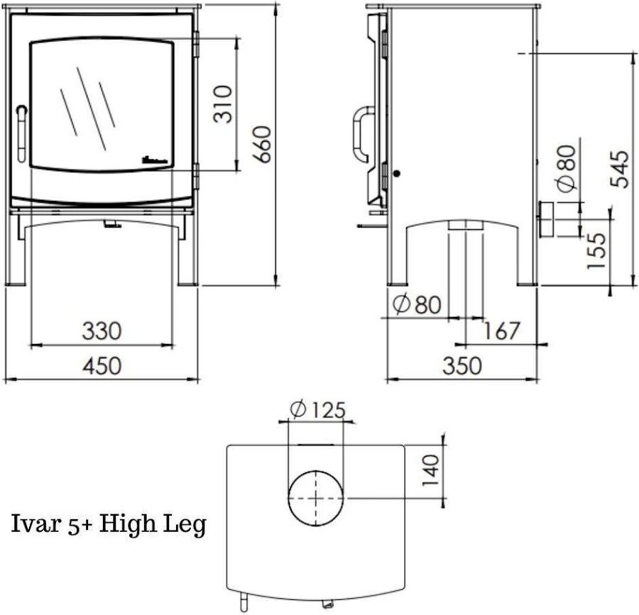 | Depth From Back to Centre of Top Flue | Ivar 5 and Ivar 5 logstore: 125mm. Ivar 5 High leg: 140mm. |
