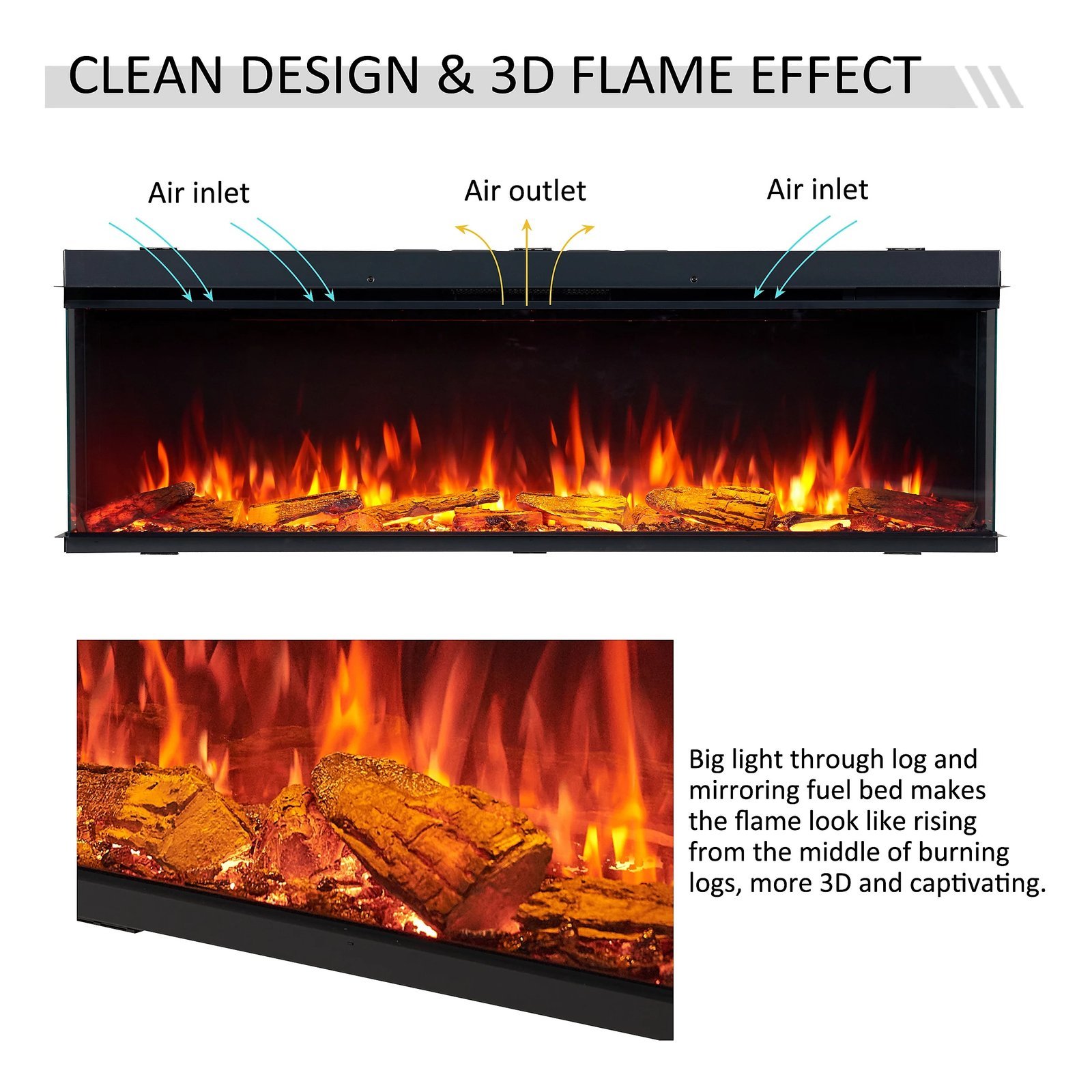 • Deep mirrored fuel bed, large translucent logs creates a more realistic flame effect.